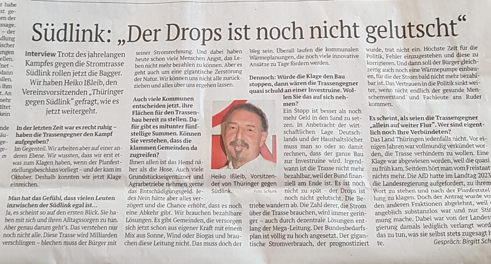 Der Verein Thüringer gegen Südlink e.V. kämpft gegen die geplante 525KV Stromtrasse Südlink . Oberstes Vereinsziel ist es das Gesamtvorhaben zu verhindern. Der Südlink dient nicht der Versorgungssicherheit einzelner Regionen Deutschlands, vielmehr dient er dem Europäischen Stromhandel(Aussage vom Bundeswirtschaftsminister Altmaier) und weniger dem ursprünglichen Ziel, grünen Strom vom Norden in den Süden Deutschlands zu bringen. Statt eines Beschleunigungsgesetzes und der Aushebung von Bürgerrechten, benötigen wir den Dialog mit Wissenschaftlern und Fachleuten, welche die Zeichen der Zeit erkannt und echte Alternativen zu den Plänen der Energiekonzerne bieten.